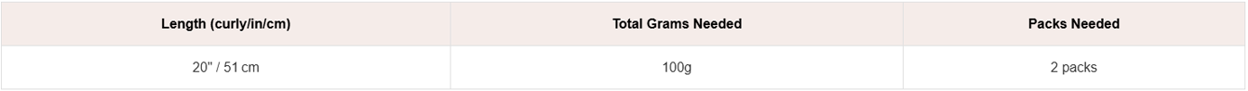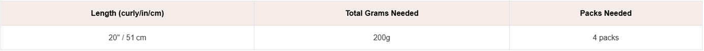 Our Curly Hair Extensions come in 50g packs with a curly length of 20″ Use this chart to see how many packs you’ll need based on your hair thickness and desired volume.